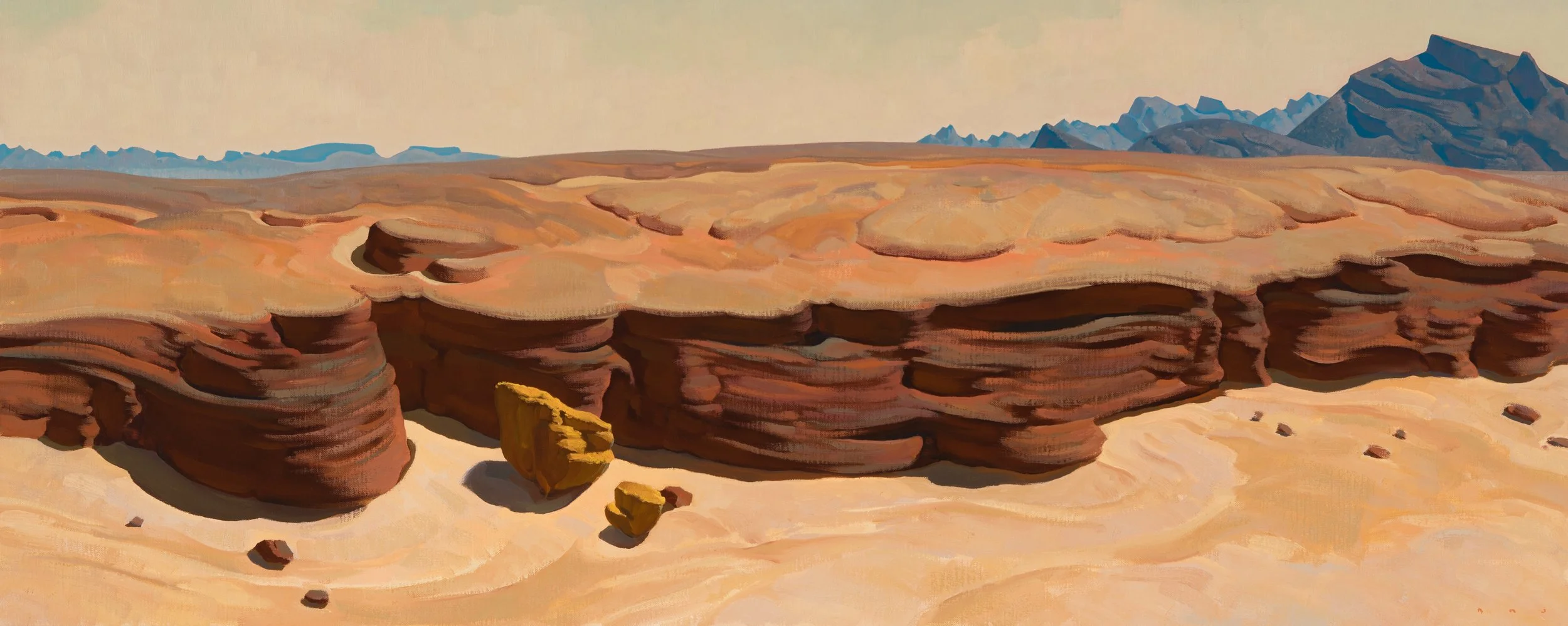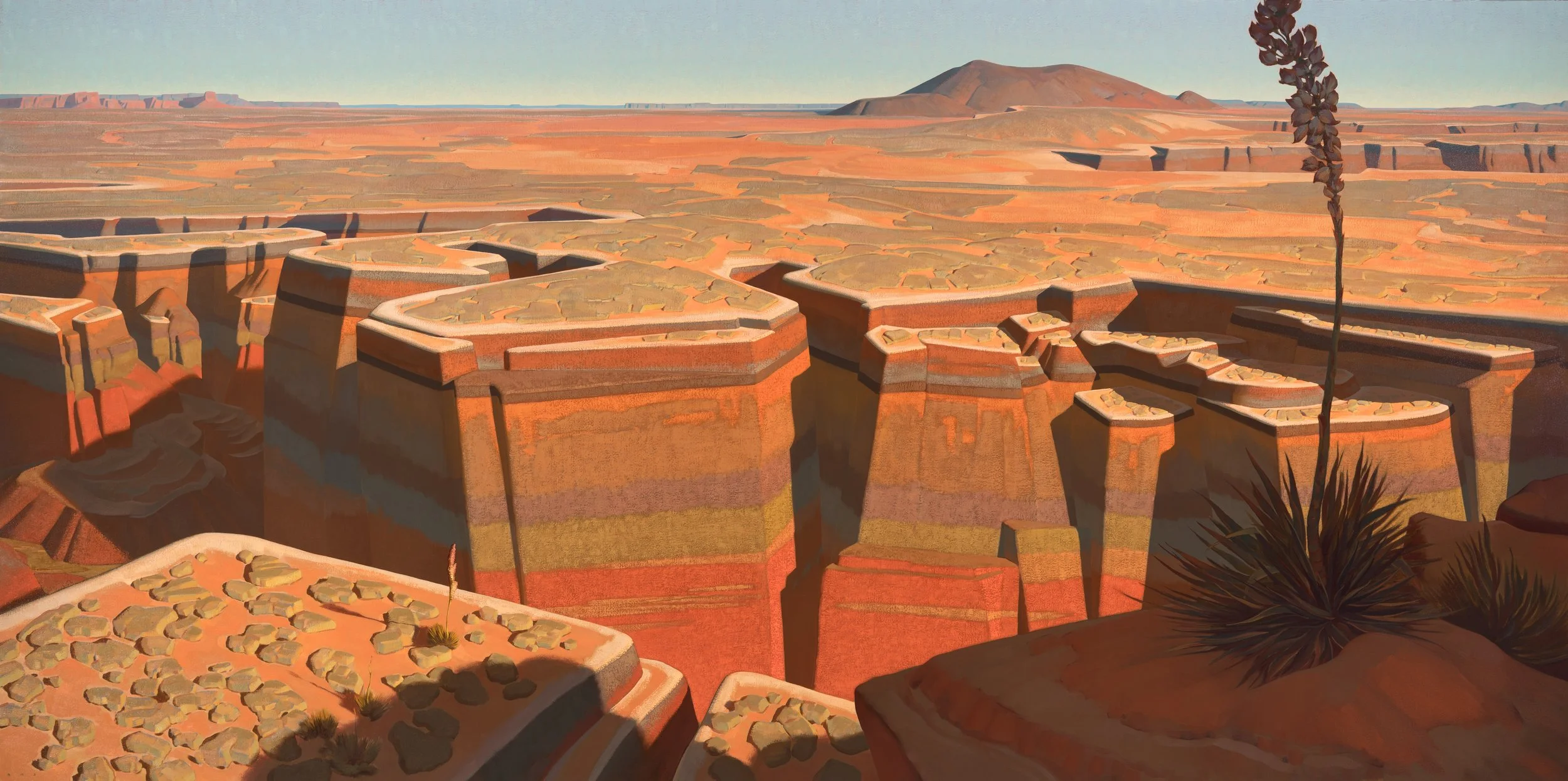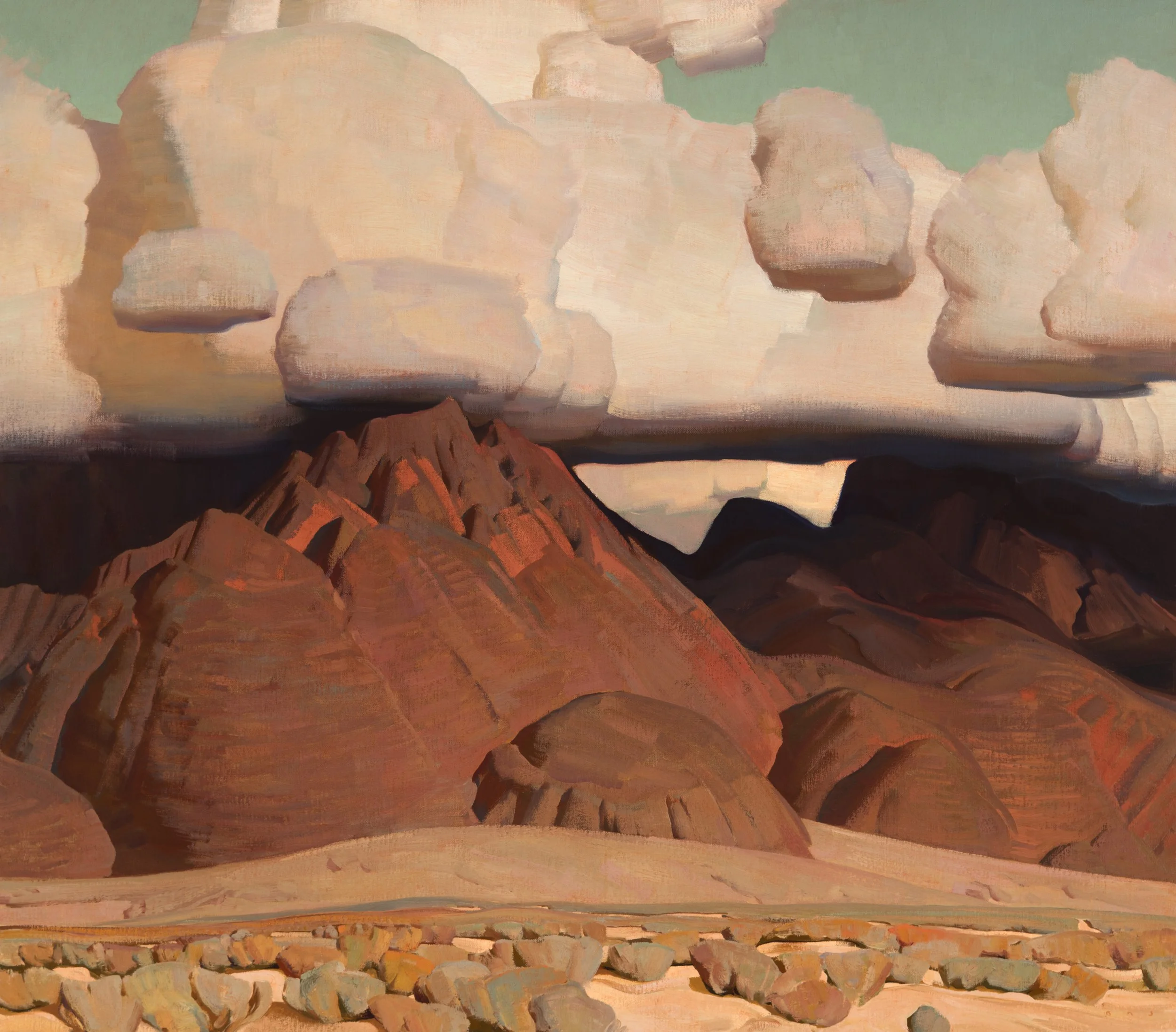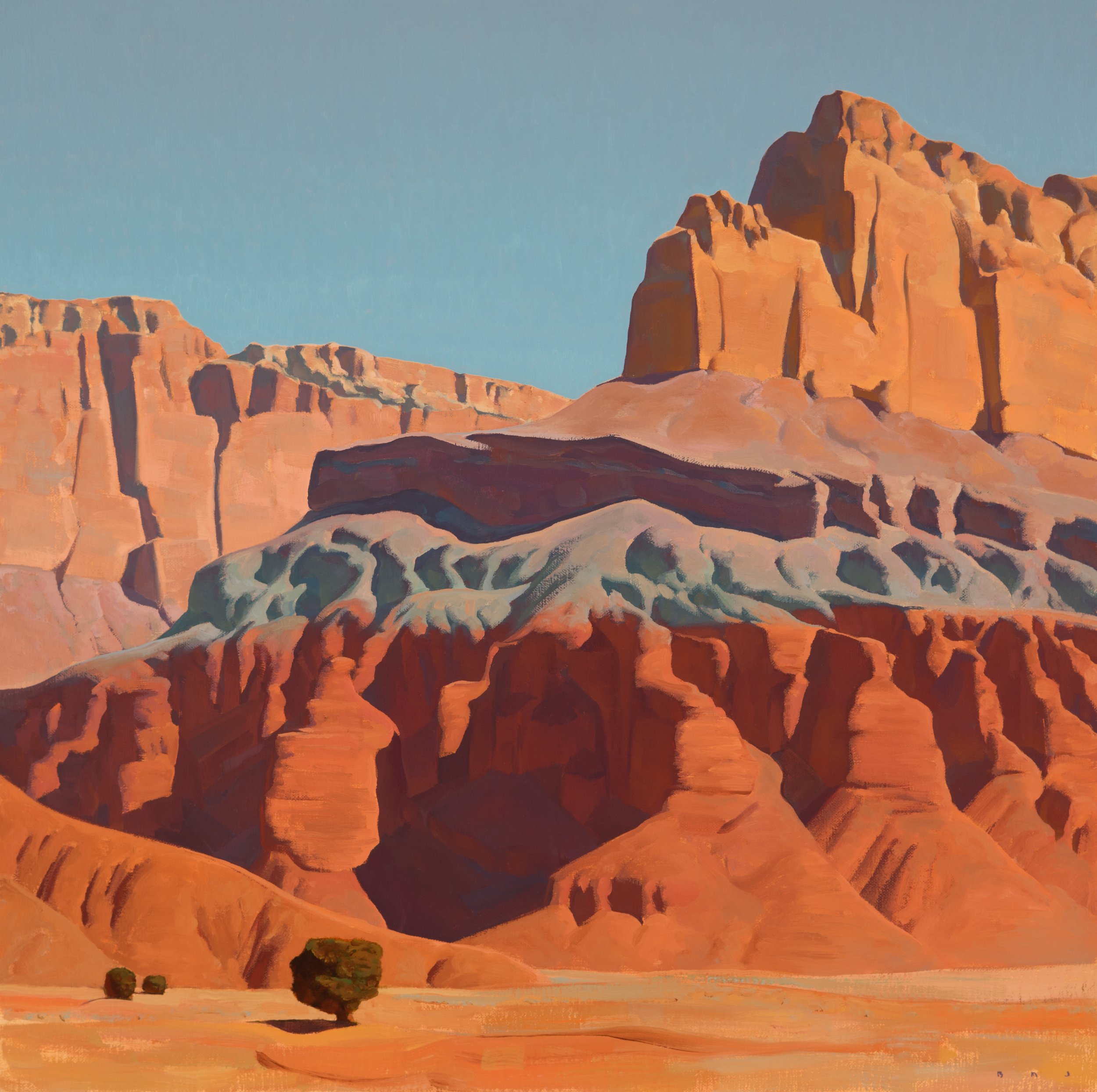 Having learned draftsmanship at a younger age, Johnson began college studying design and abstract painting. Two years into school, and soon after receiving a purchase award from the institute museum for his abstract work, he walked into an exhibition of early 20thcentury Southwestern art, and walked out with new direction. Dropping university, he deserted the classroom for the open spaces of the west, hoping to synthesize what he’d learned about design with the light and forms of the land. “These badlands and deserts, the arid canyons, the playas and great basins--- these are where my work began, where it begins.”
