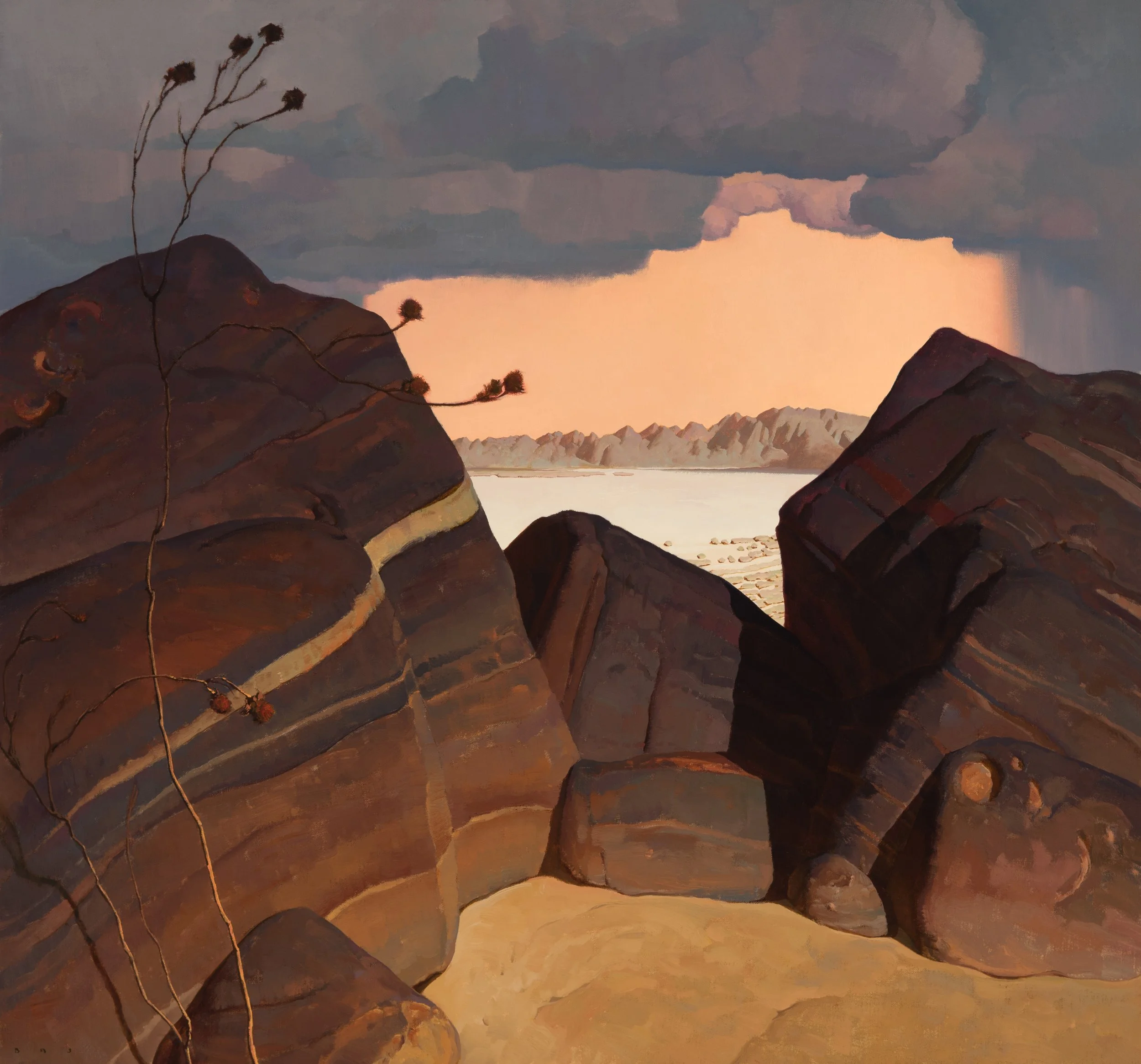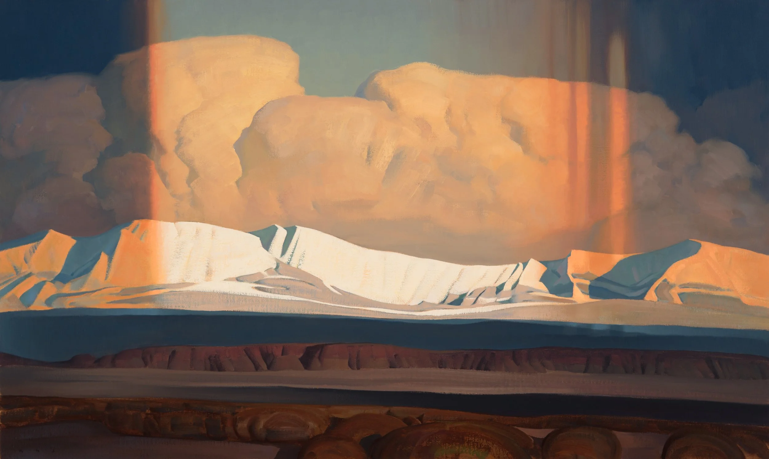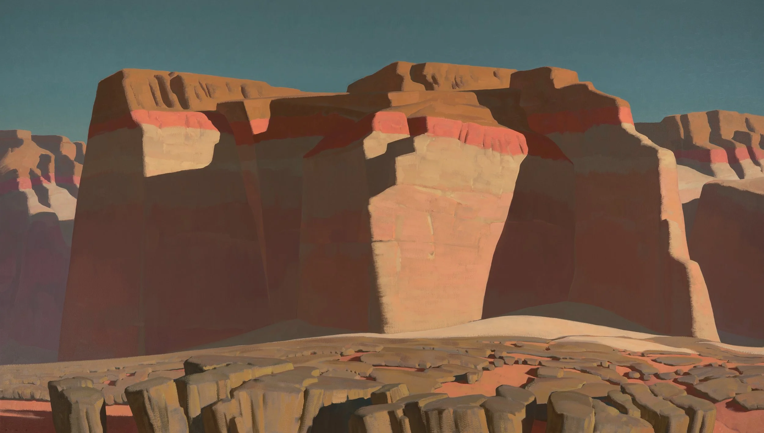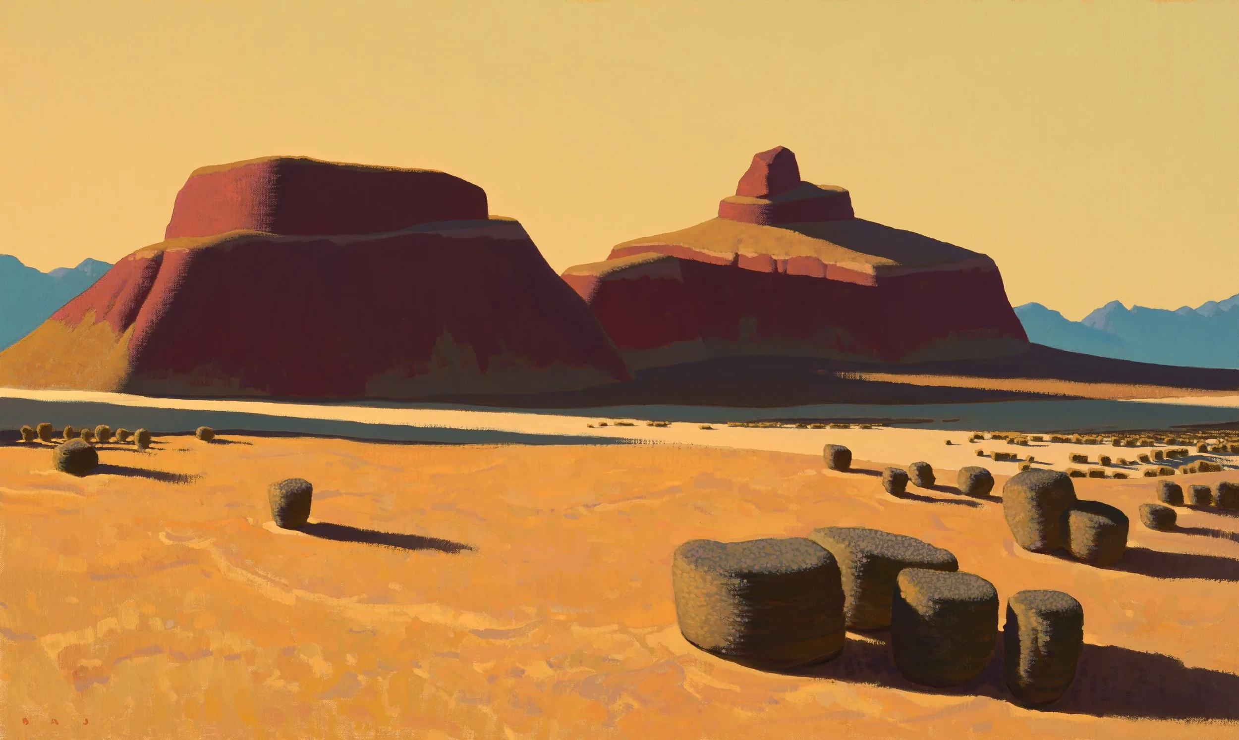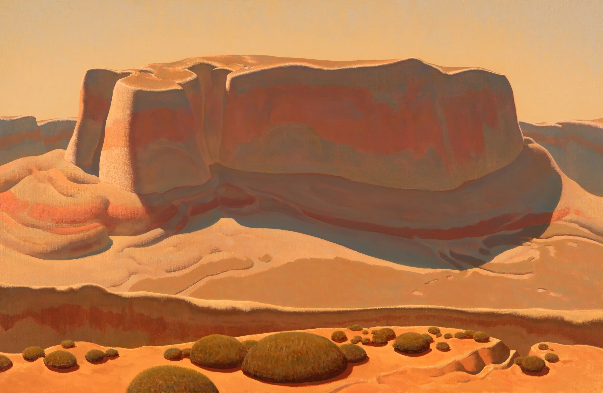Having learned draftsmanship at a younger age, Johnson began college studying design and abstract painting. Two years into school, and soon after receiving a purchase award from the institute museum for his abstract work, he walked into an exhibition of early 20thcentury Southwestern art, and walked out with new direction. Dropping university, he deserted the classroom for the open spaces of the west, hoping to synthesize what he’d learned about design with the light and forms of the land. “These badlands and deserts, the arid canyons, the playas and great basins--- these are where my work began, where it begins.”