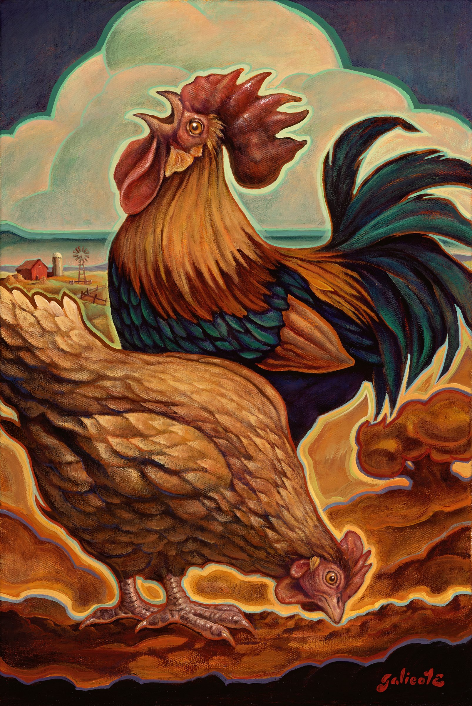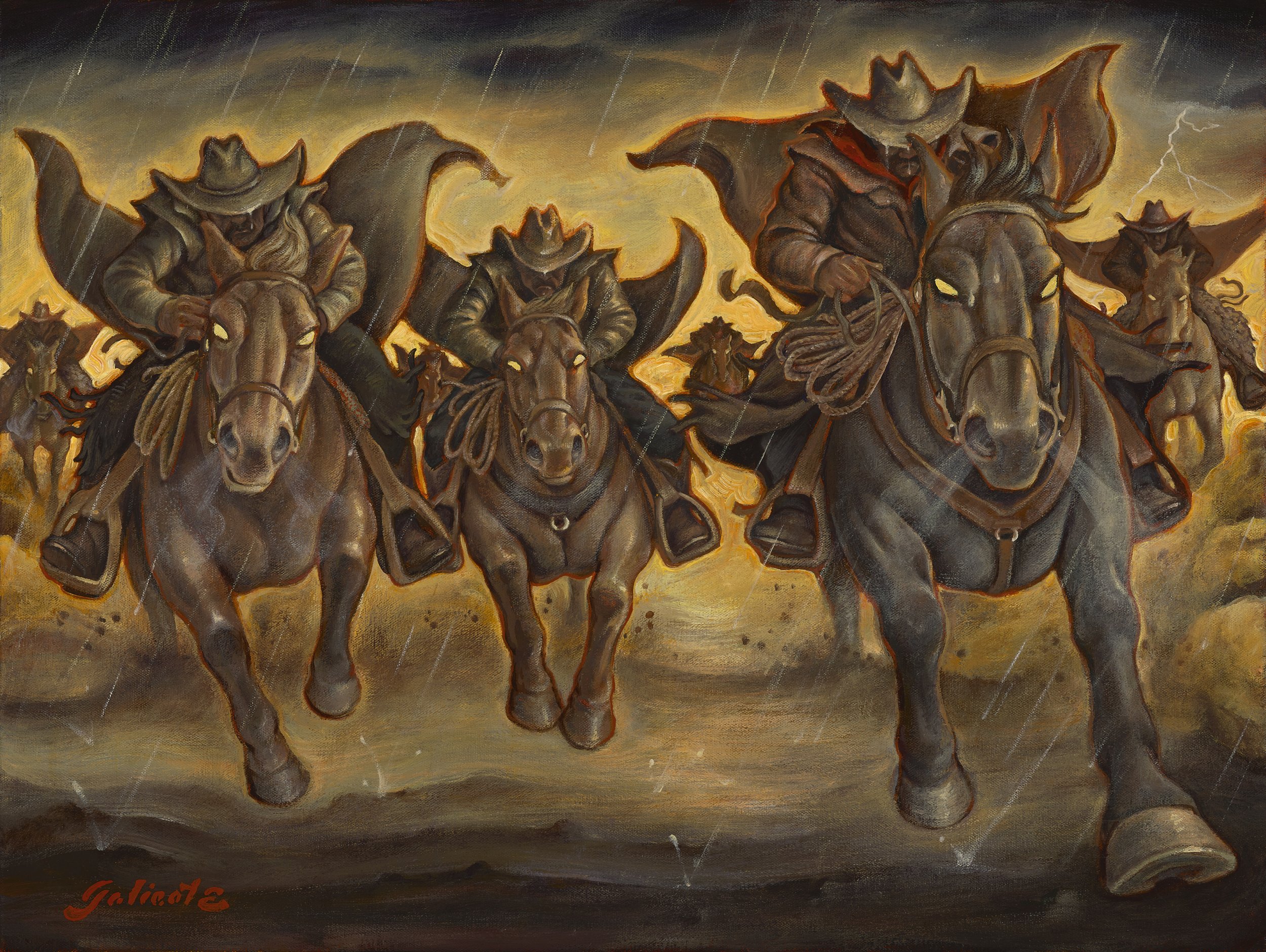 Galieote’s unique style takes cues from the drama and technical prowess of Italian Renaissance masters and the New-World optimism of American painters like Paul Cadmus, George Bellows, Thomas Hart Benton and Grant Wood. Pushing past strict stoicism, Galieote also adds a humor reminiscent of Rockwell. His work, though frequently featuring subjects and scenes from by-gone eras, does not concern itself with nostalgia; but rather with the pursuit of the universal timeless theme of human nature. His recent works of the American West, play off of these themes and combine with skill into his oeuvre, by way of memory from his early childhood on the southern California ranch.