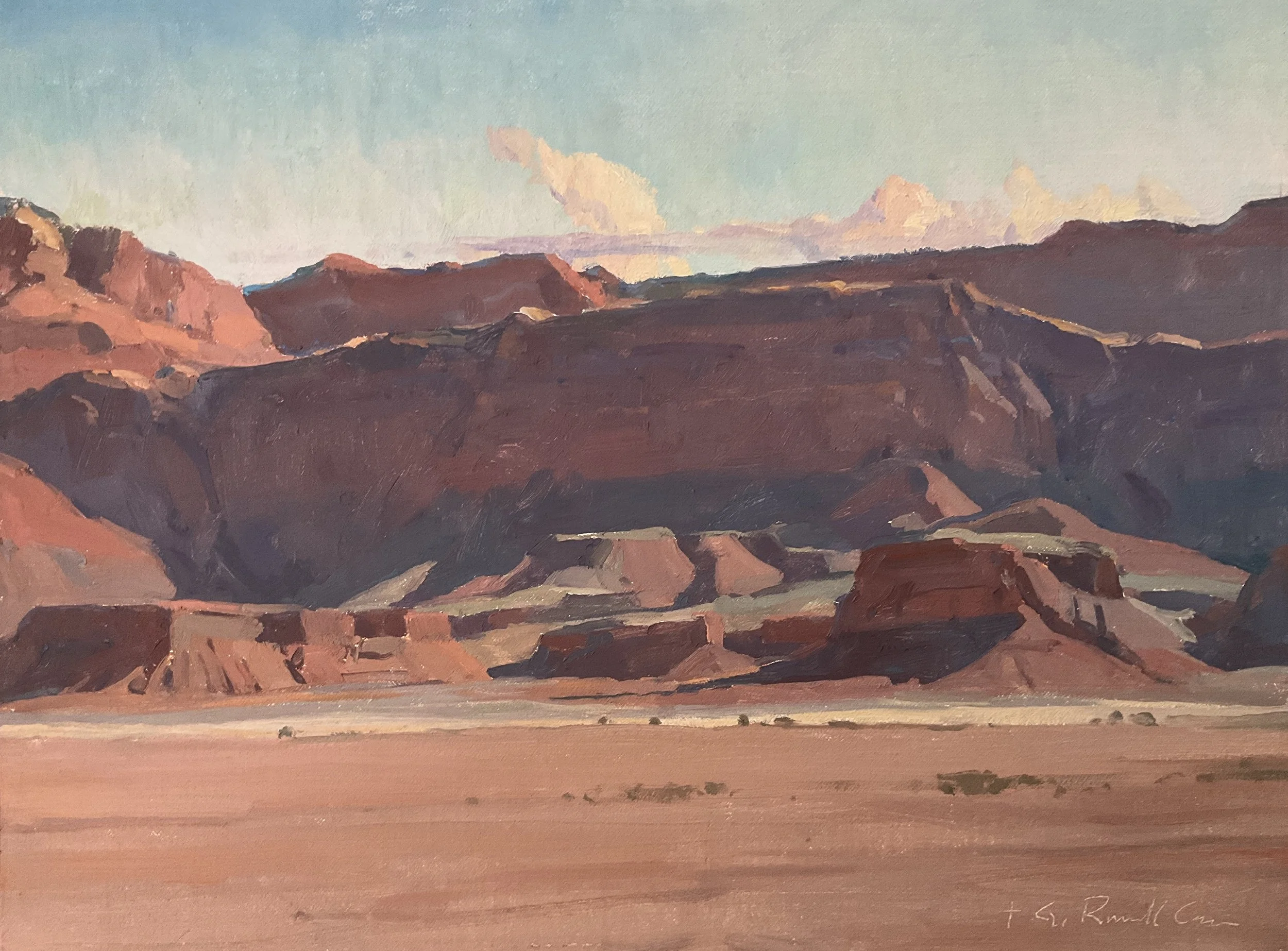 Western painter G. Russell Case is inspired by nature, but he places little value on literal translations. His sweeping, idealized versions of the western landscape are compositions that combine the beauty of the natural world with the rich imagination and originality of an artist's mind. While there is an unmistakable honesty present in his painted environments -- stemming from his engagement with the land painted directly from nature -- viewers may be reminded of other great artists of the west, whose work is marked by distinctive artistic philosophies. Case's work is unfettered by philosophy and intellect, though he is surely a student of his artistic forebears. The monumental scale of Maynard Dixon, or the unfiltered color and light of Thomas Moran both find their way into his visual language. Yet Case's work is simple, pure, and fresh; his painting draws in the viewer and delivers timeless landscapes. We are immediately transported into a world created by shadow and light, of immense vistas punctuated by jagged mountains and inhabited by lonesome cowboys.