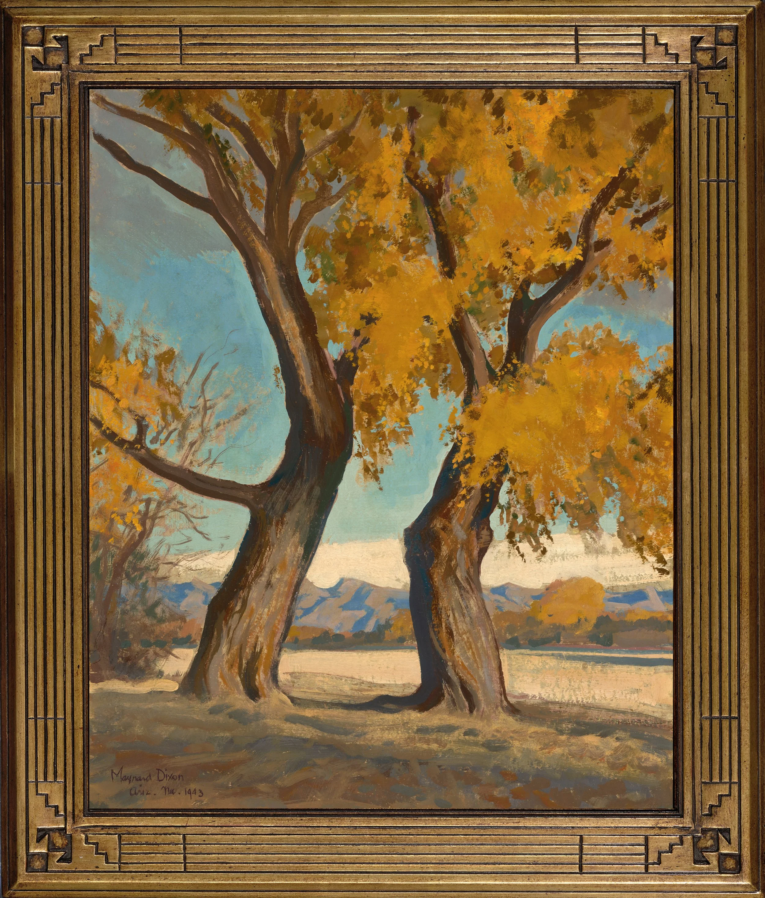 Signed Verso: “Two Cottonwoods” “Tucson, Ariz” “By Maynard Dixon” With the number 770 circled on the back matching the artist’s record of the paintings he created at the time (the corresponding numbered list of paintings will accompany this painting). Framed in a genuine gold leaf frame based on an original Dixon frame design.